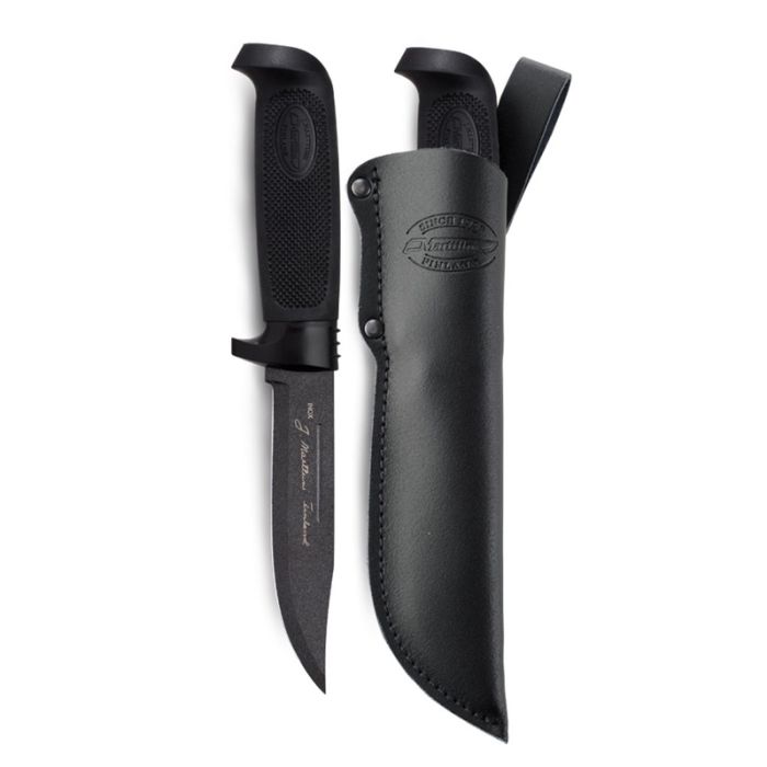 Musta puukko, myös tuppi on kokomusta. Terä Martef-pinnoitettua ruostumatonta terästä.